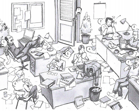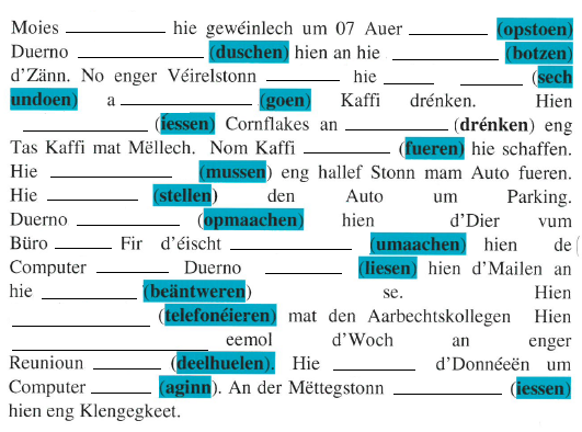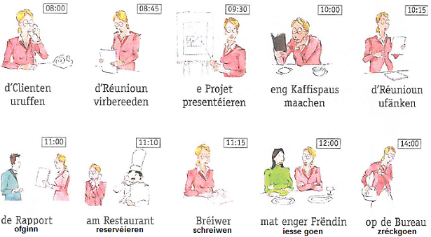 Vun 08:00 bis 12:00 Hie schafft um Büro: Hie liest d'Mailen, Hien telefonéiert a studéiert Dokumenter.